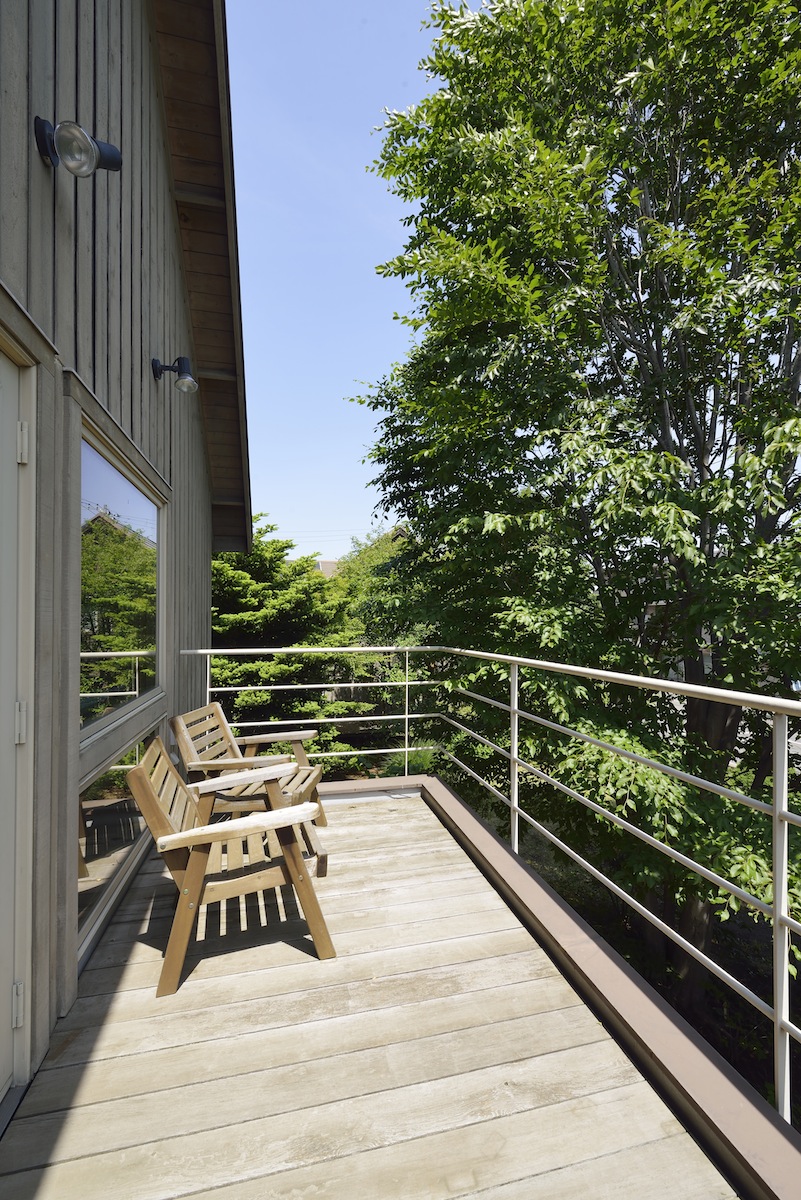 外壁は、同じ敷地内に建てた「住宅棟」と同じく、耐久性に優れた米杉チャネルサイディングや、米杉のシングル張りにステイン塗装仕上とした。敷地全体が緑豊かで、全体的に調和のとれた建築郡を実現することができた。
